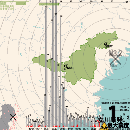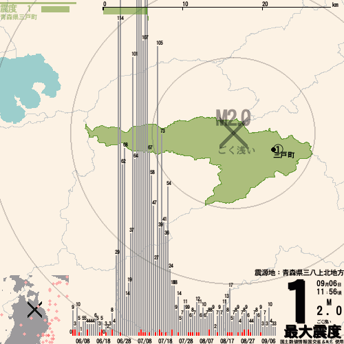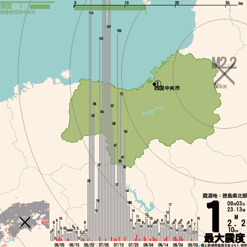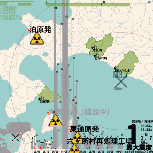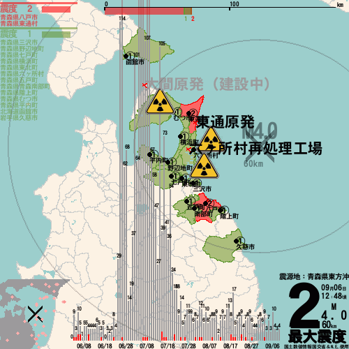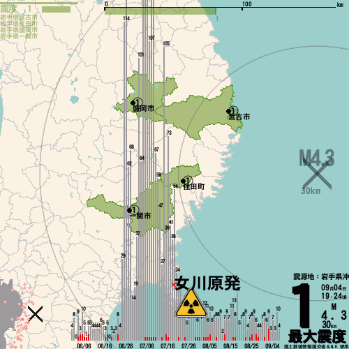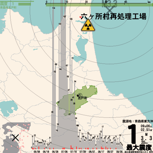 日本の地震の震度情報を、市区町村単位で、地図に描きます。地震は、地盤によって意外な揺れ方をしており、一概に近いほど揺れている訳ではありません。震度3以上の地震はプッシュ通知でお知らせします。津波注意報・津波警報が出ている場合、その旨を文字とともに、海を赤色に描画して警告します。過去の地震も閲覧できます。原子力発電所との位置関係を把握可能。
