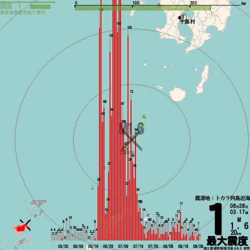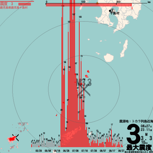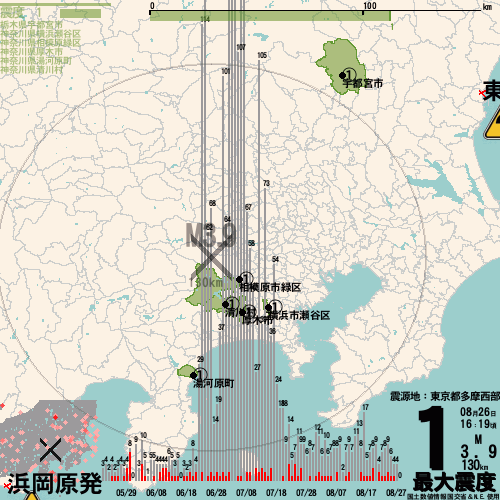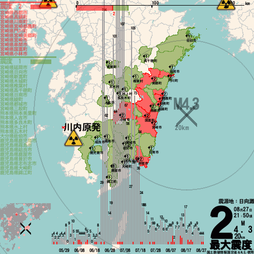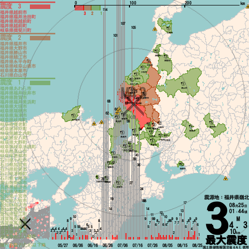 日本の地震の震度情報を、市区町村単位で、地図に描きます。地震は、地盤によって意外な揺れ方をしており、一概に近いほど揺れている訳ではありません。震度3以上の地震はプッシュ通知でお知らせします。津波注意報・津波警報が出ている場合、その旨を文字とともに、海を赤色に描画して警告します。過去の地震も閲覧できます。原子力発電所との位置関係を把握可能。